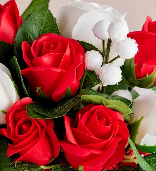 Can you believe all these flowers are made from soap? Handmade soap flowers! A beautiful arrangement of soap flowers in a red ceramic vase. Size 7″ x 10″