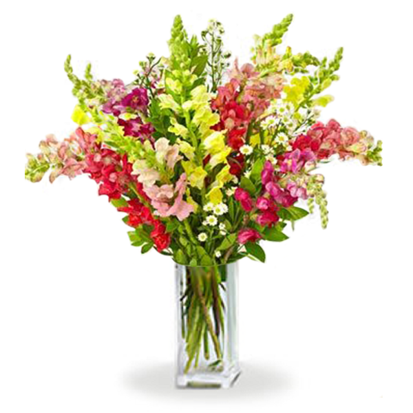 This superb bouquet illuminates any room with its vibrant array of colours. This bouquet includes 8 assorted colour snapdragons with fresh greens. Vase not included.