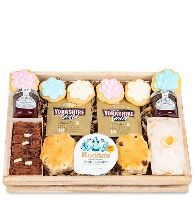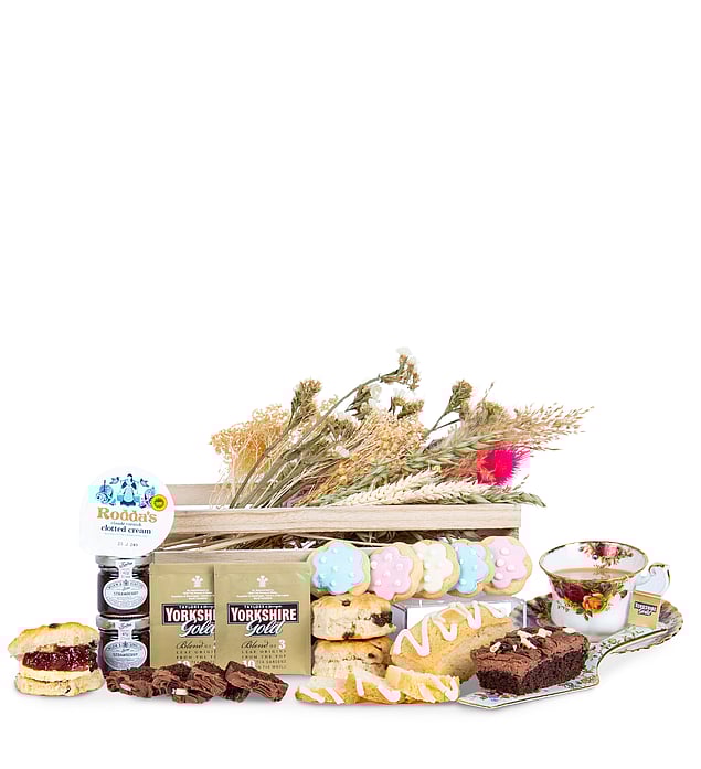 Indulge in our Afternoon Tea Crate the perfect gift for any occasion. Handmade in Yorkshire, our exquisite Flower Shaped Shortbread steals the spotlight with intricate designs and a perfect blend of sweetness. Paired with two artisanal Handmade Scones and Clotted Cream. Delight your senses further with the zesty Lemon Loaf Cake and velvety Chocolate Loaf Cake, while two jars of Strawberry Preserves add a sweet and tangy touch. Presented in a charming wooden tray.