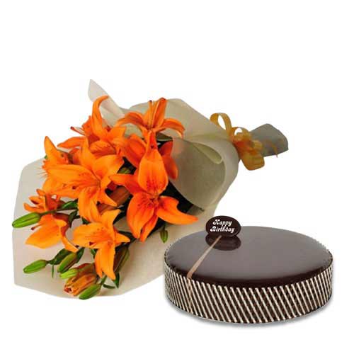 Combo of 4 stems of Orange Lilies Bouquet with 1 kg chocolate mud cake