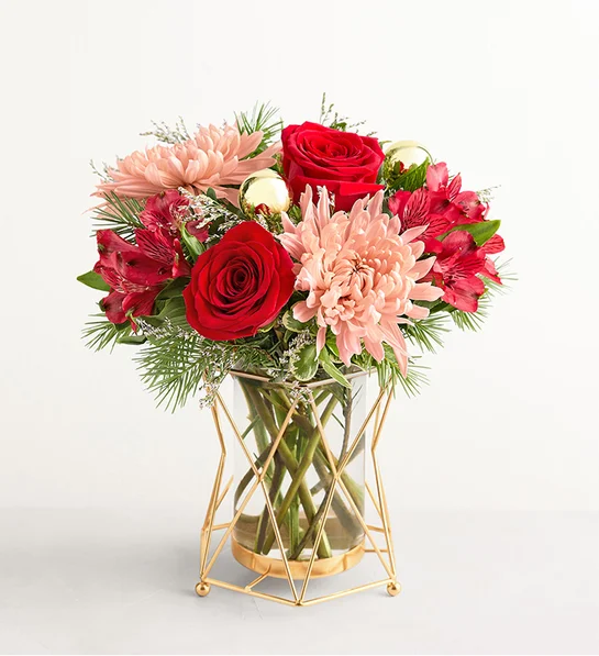 - Arrangement of red roses and Peruvian lilies (alstroemerias), pink mum disbuds, and purple limonium, accented with assorted Christmas greenery