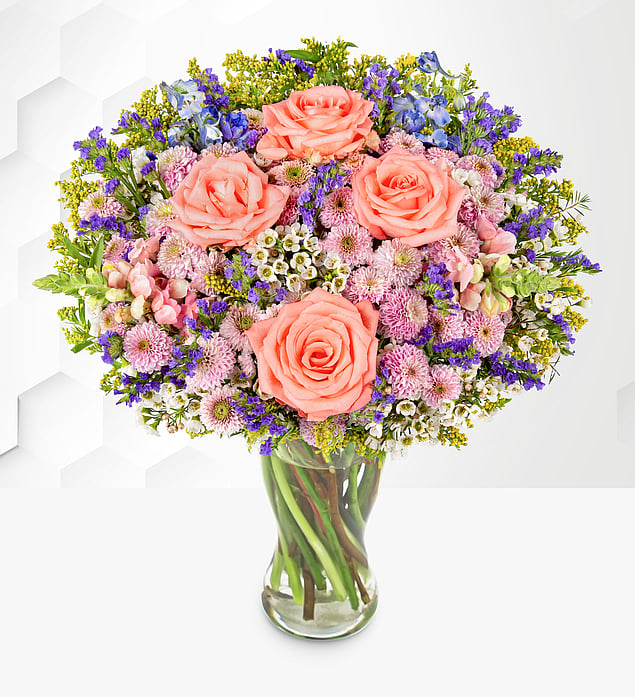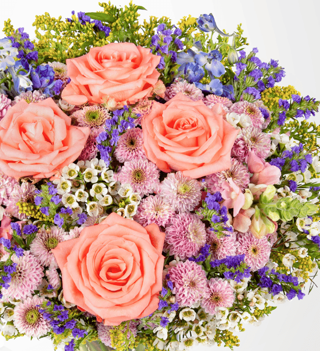 TOP SELLER Introducing our captivating Ethereal Delight Bouquet, a delightful blend of colours and textures that brings the beauty of a blooming meadow right into your home. This exquisite arrangement features the enchanting blue delphinium donna, delicate white waxflowers, and charming pink snapdragons. Complementing these are the vibrant double santini pink doria chrysanthemums and the elegant lady margaret roses, creating a harmonious palette of blues, pinks, and whites. Accents of blue statice and lush solidago add depth and richness, enhancing the bouquet’s natural beauty. Perfect for any special occasion, the Ethereal Delight Bouquet radiates a fresh, cheerful ambiance that brightens any space. Whether you’re celebrating a special event or simply bringing a touch of nature indoors, this bouquet is a stunning choice. Each flower has been thoughtfully selected to create a balanced and harmonious composition, making it an extraordinary gift for family or friends to celebrate any special occasion. Embrace the essence of the sea with this exquisite floral arrangement, offering a blend of elegance, charm, and timeless beauty.