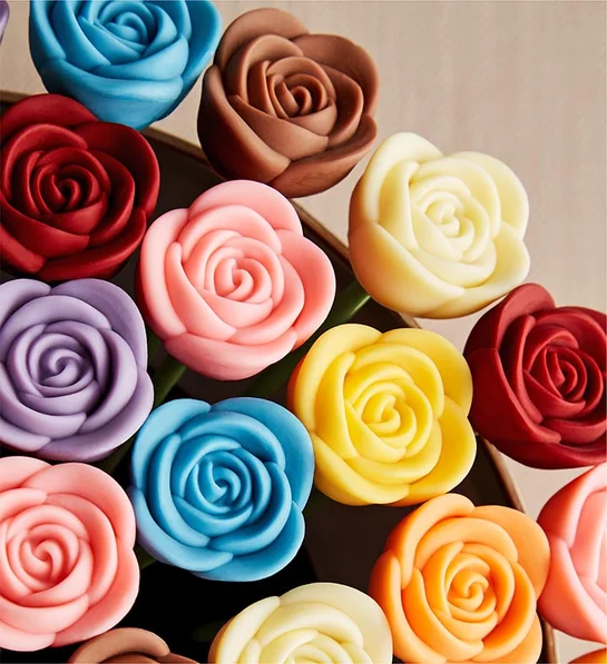 - Arrangement features festive, color-tinted white Belgian chocolate roses, milk Belgian chocolate roses, and red-tinted Belgian white and dark chocolate roses