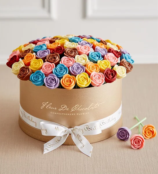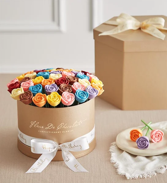 - Individually wrapped and presented in a reusable gold hatbox with a coordinated “Happy Birthday” satin bow and Fleur De Chocolate® branding