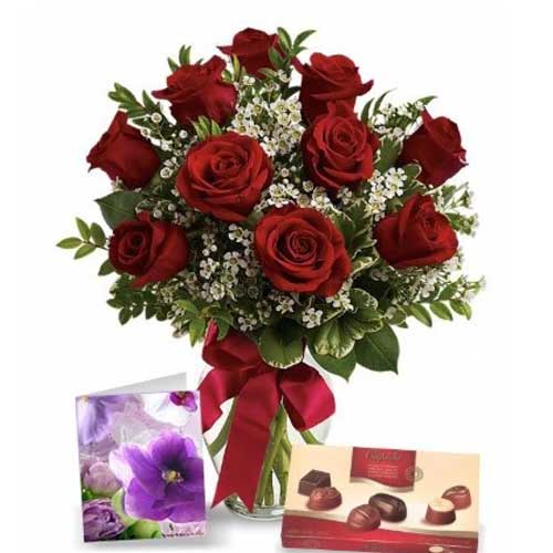 6 fresh-cut red roses accented with stems of limonium, stems of tiki, and fresh greens with greeting card and premium chocolate ( vase not included