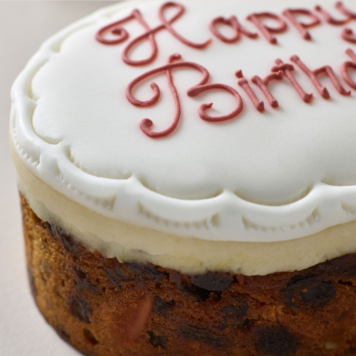 Brimming with plump vine fruits, sticky cherries and flecked with candied citrus, this deliciously rich and moist Fruit Cake is topped with layers of marzipan and soft sugar icing, then hand-piped with a delicate pattern and a joyful ‘Happy Birthday’ in a celebratory red icing.