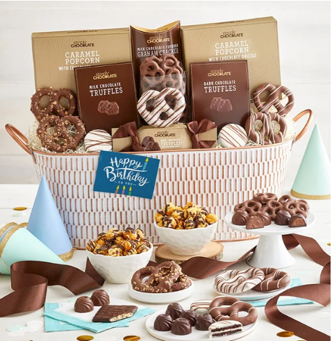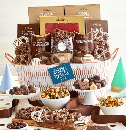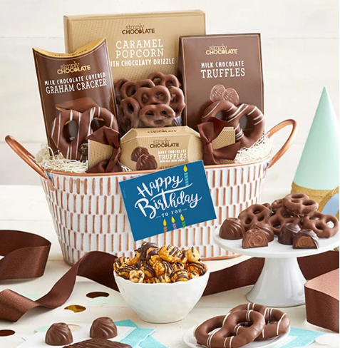 Give the gift of sweetness on their special day with this indulgent chocolate-filled basket, designed to make any birthday celebration extra memorable. This indulgent basket is bursting with a curated selection of irresistible treats ranging from rich and smooth Simply Chocolate® truffles to crunchy chocolate covered pretzels and popcorn. The perfect way to wish them a day full of joy and delicious surprises!