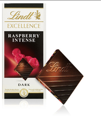 Tasty 100g block of dark chocolate with real raspberry pieces.
