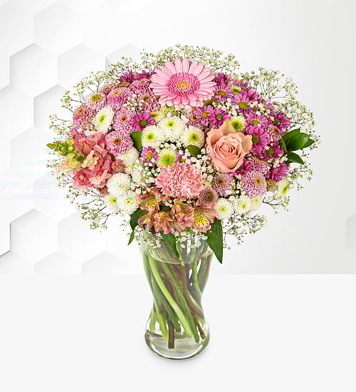 Celebrate elegance and charm with our stunning Rosé Serenade bouquet, a dreamy arrangement bursting with delicate pink hues. Featuring luxurious pink roses, vibrant germinis, soft chrysanthemums, and elegant antirrhinum, this bouquet is designed to impress. Accented with pink and white santini, delicate carnations, and fluffy gypsophila, all beautifully complemented by lush ruscus foliage, this arrangement radiates grace and beauty.