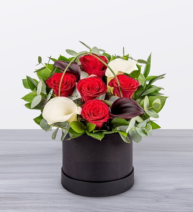 Introducing the Scarlet Noir Hatbox, a bold and elegant floral arrangement that blends romance with drama. Deep red Rhodos roses pair beautifully with pure white calla lilies, while striking black calla lilies add a hint of mystery. Accents of steel grass, cinerea, and ruscus complete the look, bringing texture and balance to this unforgettable gift.