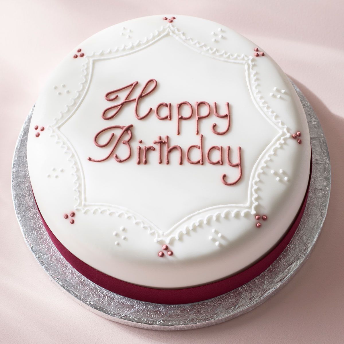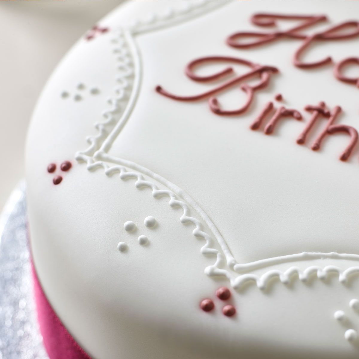 Brimming with plump vine fruits, sticky cherries and flecked with candied citrus, this deliciously rich and moist fruit cake is topped with layers of marzipan and soft sugar icing, then hand-iced with a delicate pattern and a joyful ‘Happy Birthday’ in cheering red – finished with a ribbon to match