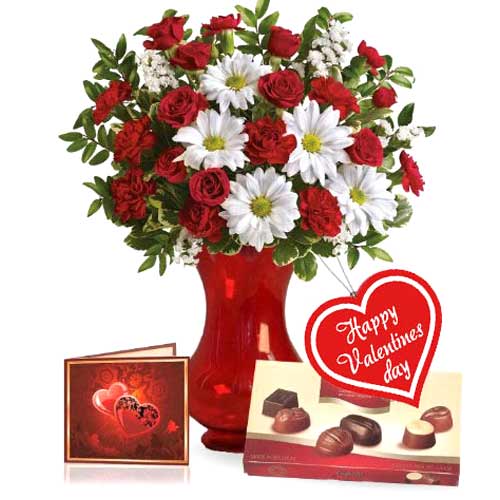 Bouquet of radiant roses, carnations, and daisies. includes a decadent box of gourmet chocolates and a full-sized card (vase not included
