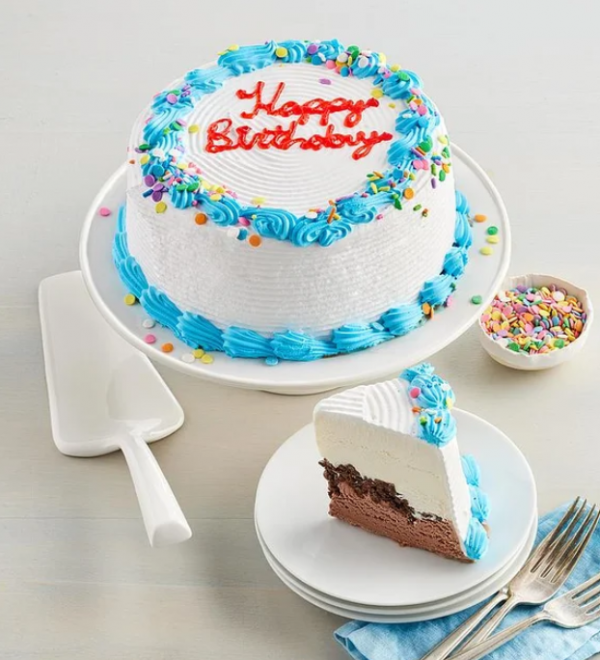 - Chocolate and vanilla ice cream cake topped with whipped frosting, chocolate-flavored crunchies, and rainbow confetti
